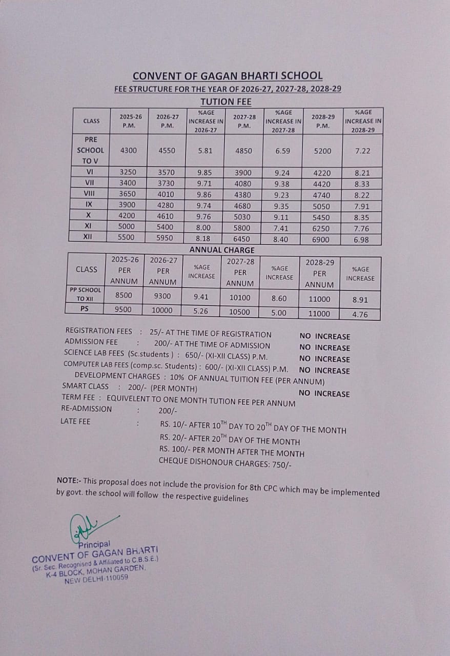Convent of Gagan Bharti Sr. Sec. School, is an English Medium Co-Educational Public School recognised by. Directorate of education GNCT of Delhi up to senior secondary level & Affiliated to C.B.S.E. with all the three streams, situated at k-4 Block, Mohan Garden, New Delhi-59. It was established in the year 1997. It is unique in its own way. First, it has an ideal and pollution free environment with a magnificent airy and spacious four storey building fitted with ultra modern Intercom System and close circuit T.V. cameras. It is 10+2 school with Science, Commerce and Humanities streams. It enjoys a prominent position in the field of education the through its excellent 100% results of 10th and 12th for many years in the area. The school has stood for this marvellous achievement consistently for many years. The school has won many Medals in National School Games, C.B.S.E. National Championship and State level Championships.